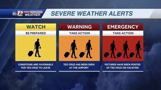 My friend Mike from Austin, Texas shared this one when news broke that Ted Cruz was, once again, leaving his state before a major storm was due. If you’re not aware, Cruz was dragged on social in 2021 for vacationing in Cancun while his constituents suffered through hurricane Beryl.