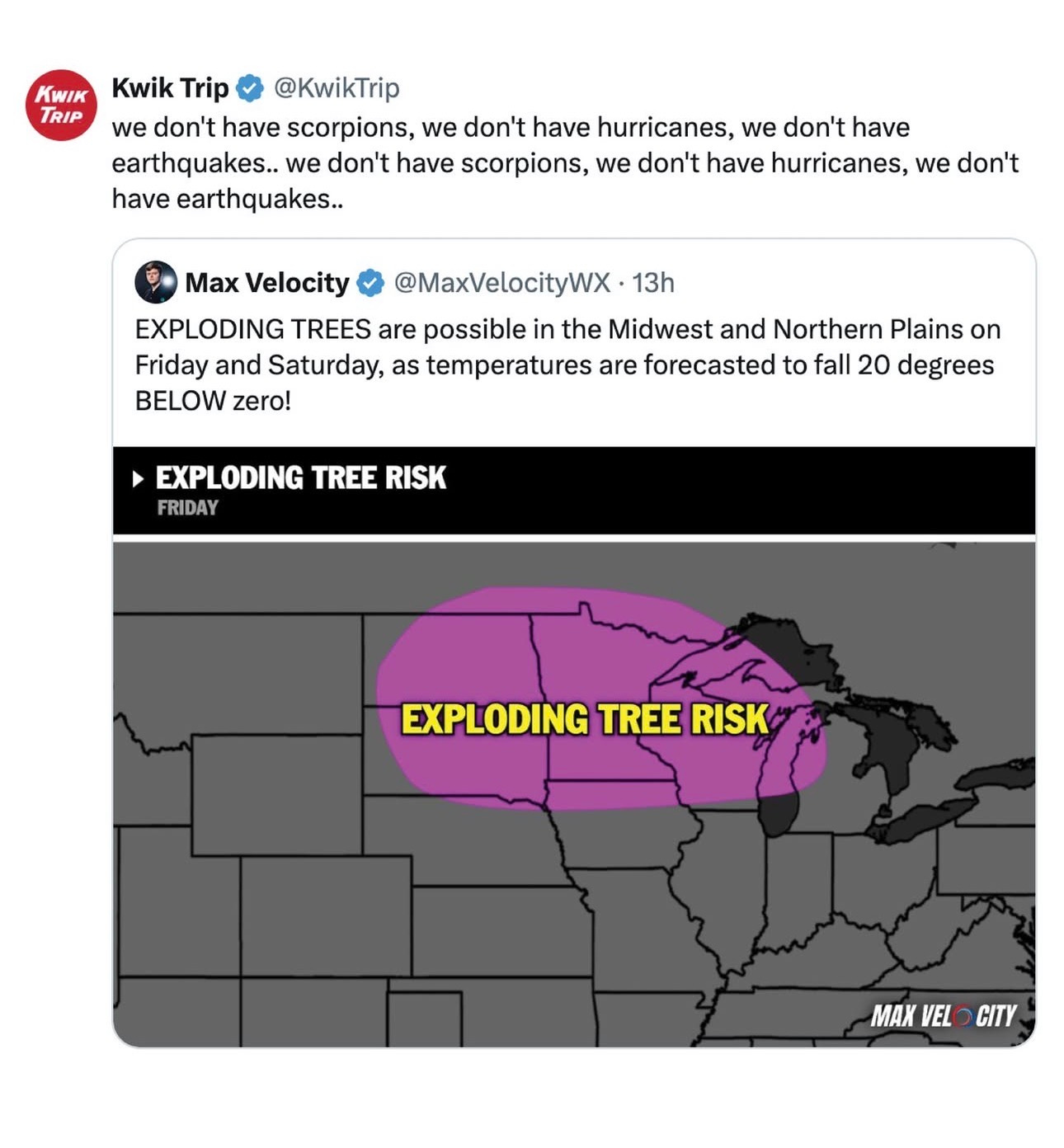 I had to cover this one given the frigid, snowy, icy weather much of the country is experiencing. Last week, I saw this post making the rounds - nice to see someone with a sense of humor at the helm of Kwik Trip’s socials: